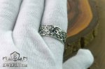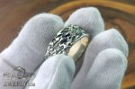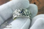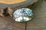 Кольцо выполнено из серебра 925 пробы и декорировано фактурной поверхностью с чернением, которое подчёркивает рельеф и придаёт изделию выразительный вид. В центре аккуратно закреплён камень - натуральный сапфир синего цвета диаметром 2,5 мм.